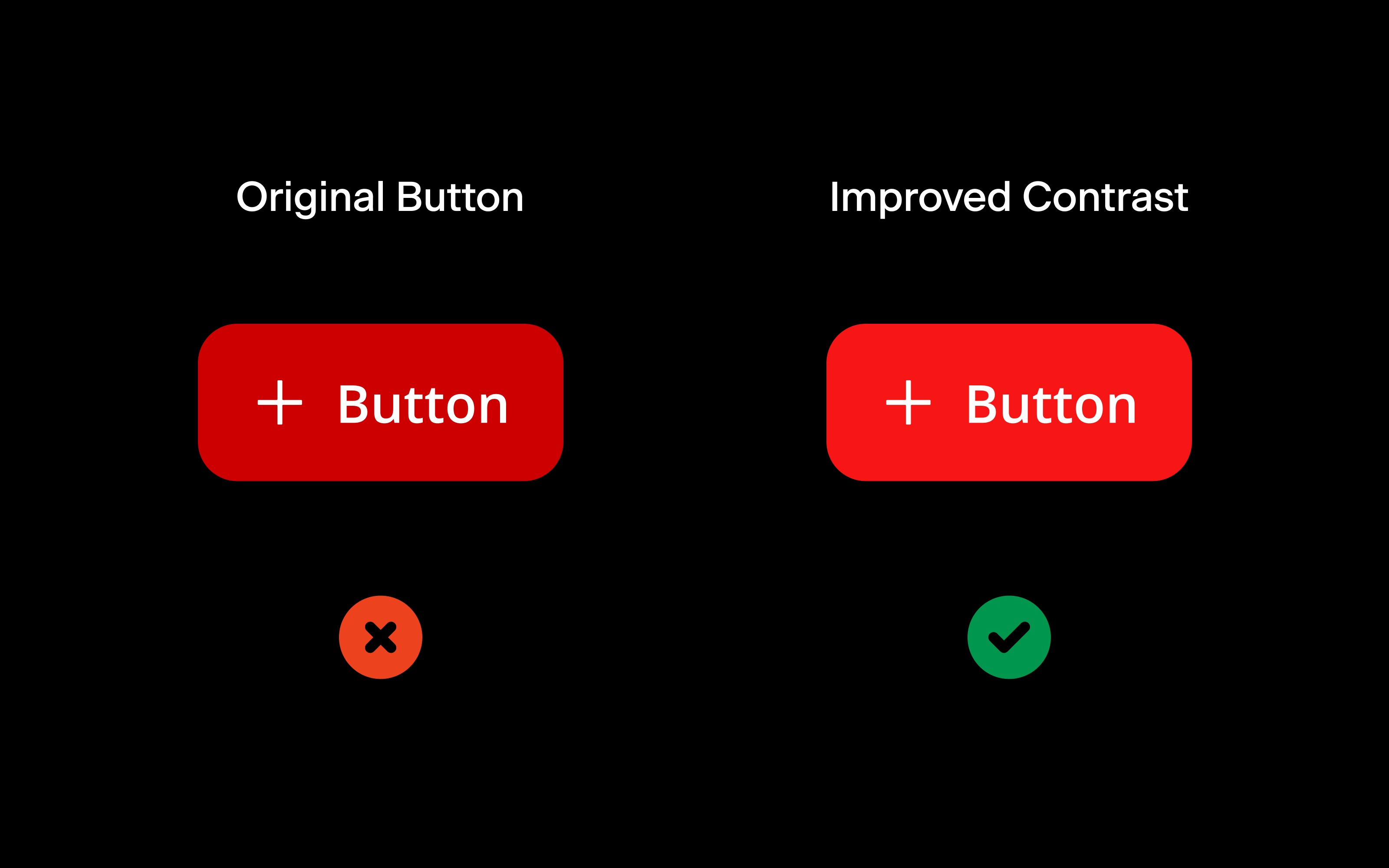 At the start of the process, we actually had designed the Primary Button in dark mode to be darker than the light mode version. Our hypothesis at the time was that since dark mode is built for viewing in darker settings, we would want that button to match that. We noticed however that this button was extremely hard to see and differentiate from the background. We shifted the background colour of this button to be two shades lighter to improve contrast from the background.