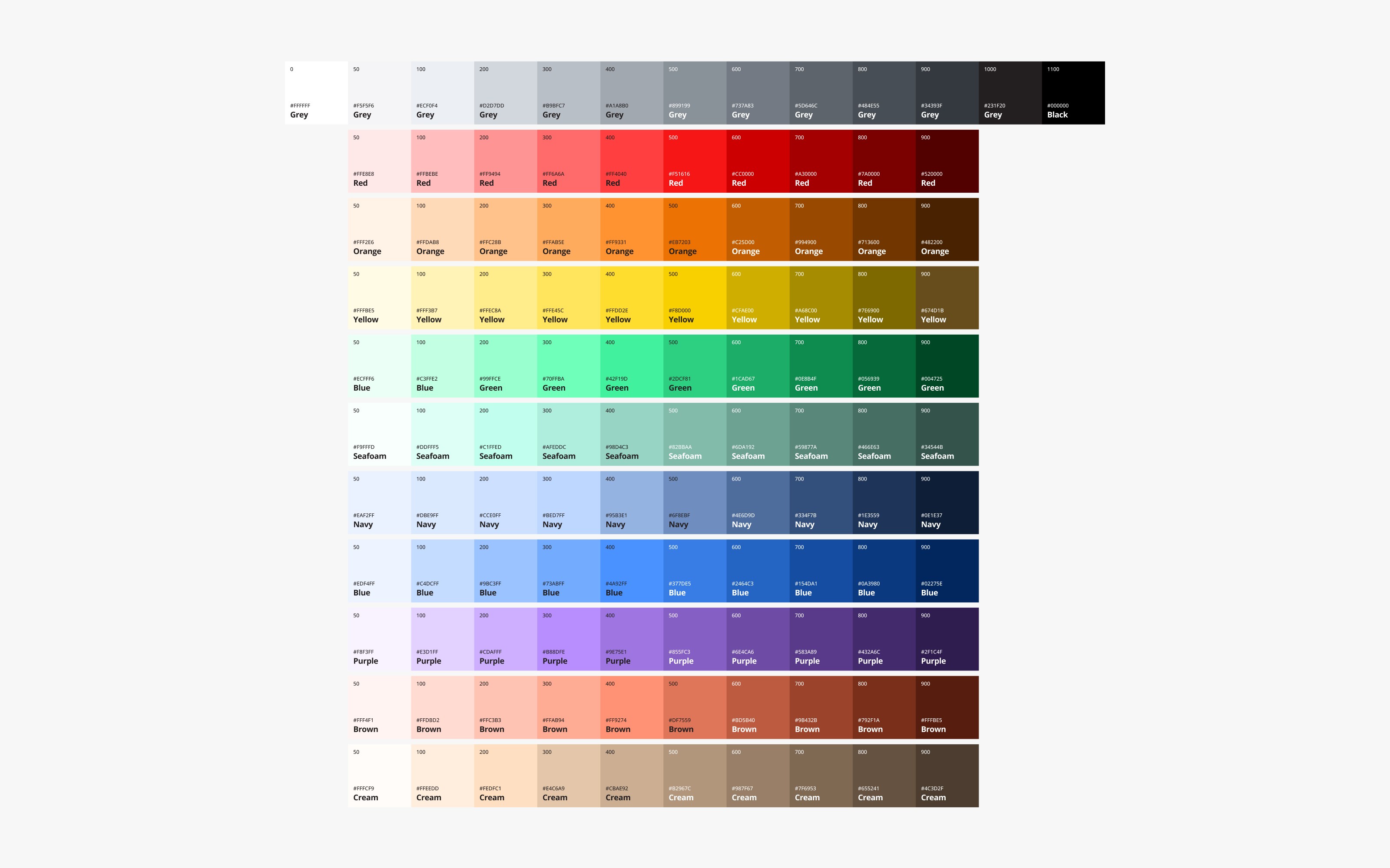 For most colours, we set out to define 10 variants of lightness in order to create an extensive palette to work with. The exception to this rule was grey sub-palette where we defined 13 variants to make sure that there would always be an appropriate colour to choose from when designing the interface.